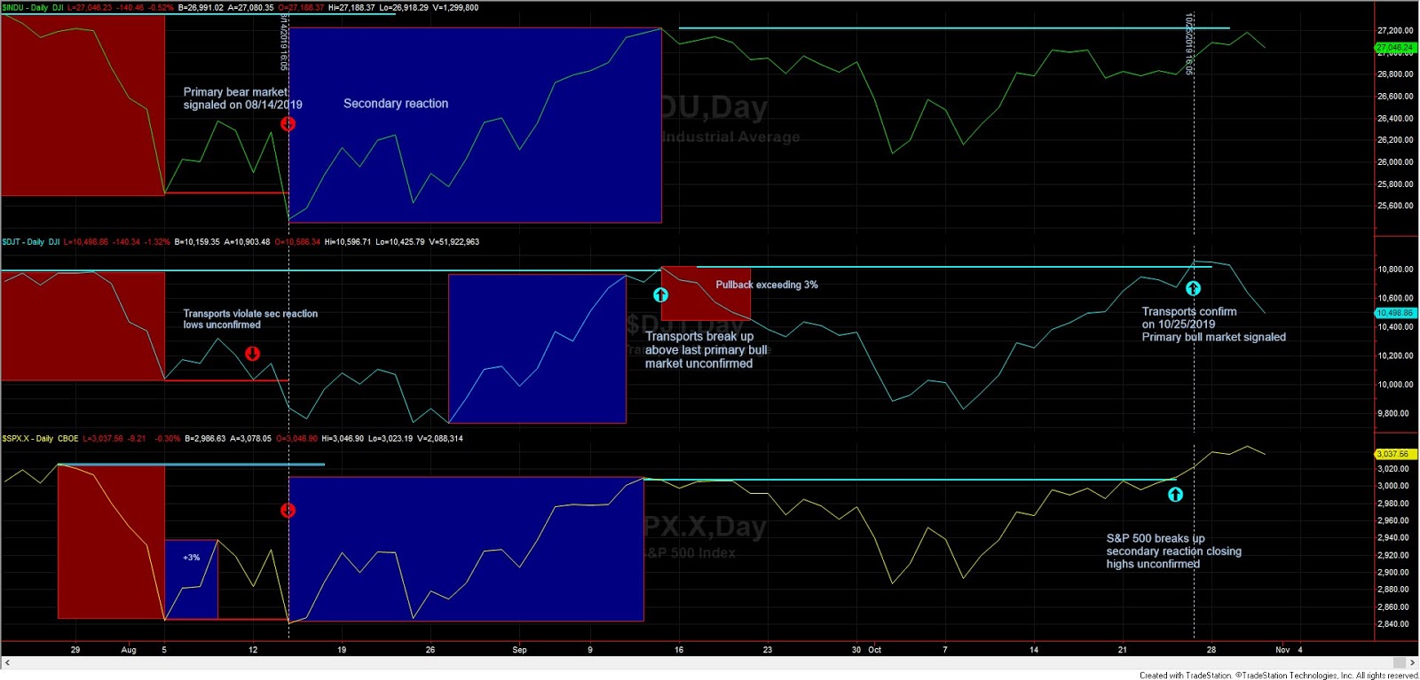 Stocks were under a primary bear market (more about it here). Such a primary bear market did not have long legs and no sooner had been signaled, a secondary reaction against the primary bear market started. That secondary reaction finished on 09/13/2019 for the Industrials, on 09/11/2019 for the Transports, and on 09/12/2019 for the S&P 500 (blue rectangles in the middle of the charts). From those dates a pullback got started. The first index to decline more than 3% was the Transports (orange rectangle, after the blue rectangle of the middle chart) on 09/20/2019 followed by the other two indices. Hence, on 09/20/2019 the setup for a primary bull market had been completed.
