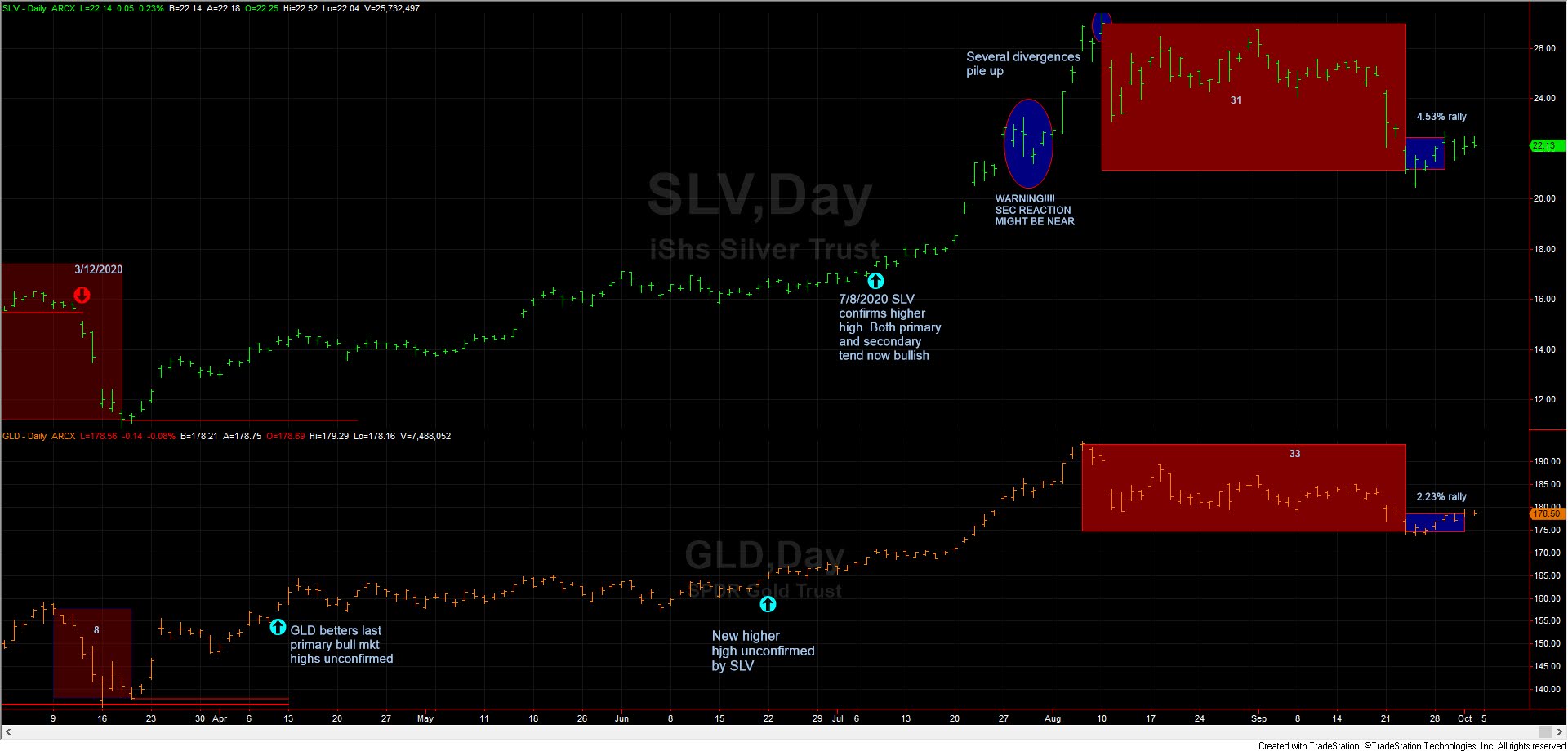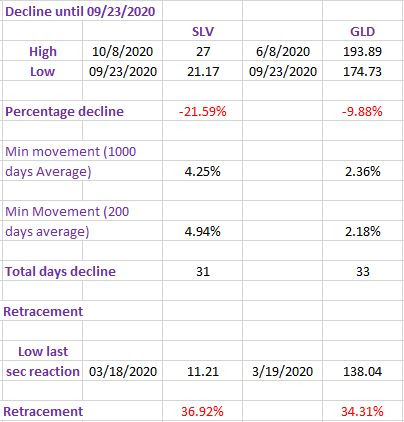 From the September 23rd, 2020 closing lows, SLV rallied 4.53% until 9/29/2020. GLD rallied 2.23% until 10/01/2020 (unconfirmed by GLD). As you can see in the spreadsheet above, we are barely reaching the minimum-adjusted movement to setup SLV and GLD for a primary bear signal. So I’d like to see some more market action in order to unambiguously state that the setup for a primary bear market has been completed. We are in a borderline situation. However, if GLD and SLV suddenly broke down below their 09/23/2020 secondary reaction lows, and such a decline were with heavy volume, I think I’d act and declare a primary bear market signal because of the following reasons: