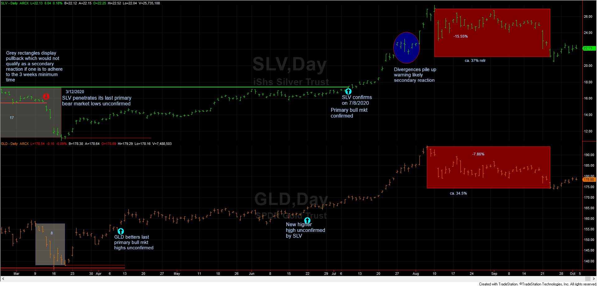 On September 23rd, 2020, the secondary trend turned unambiguously bearish (secondary) reaction. SLV declined for 31 days and GLD for 33. So the time requirement, even when one takes the longer view, has been amply met.