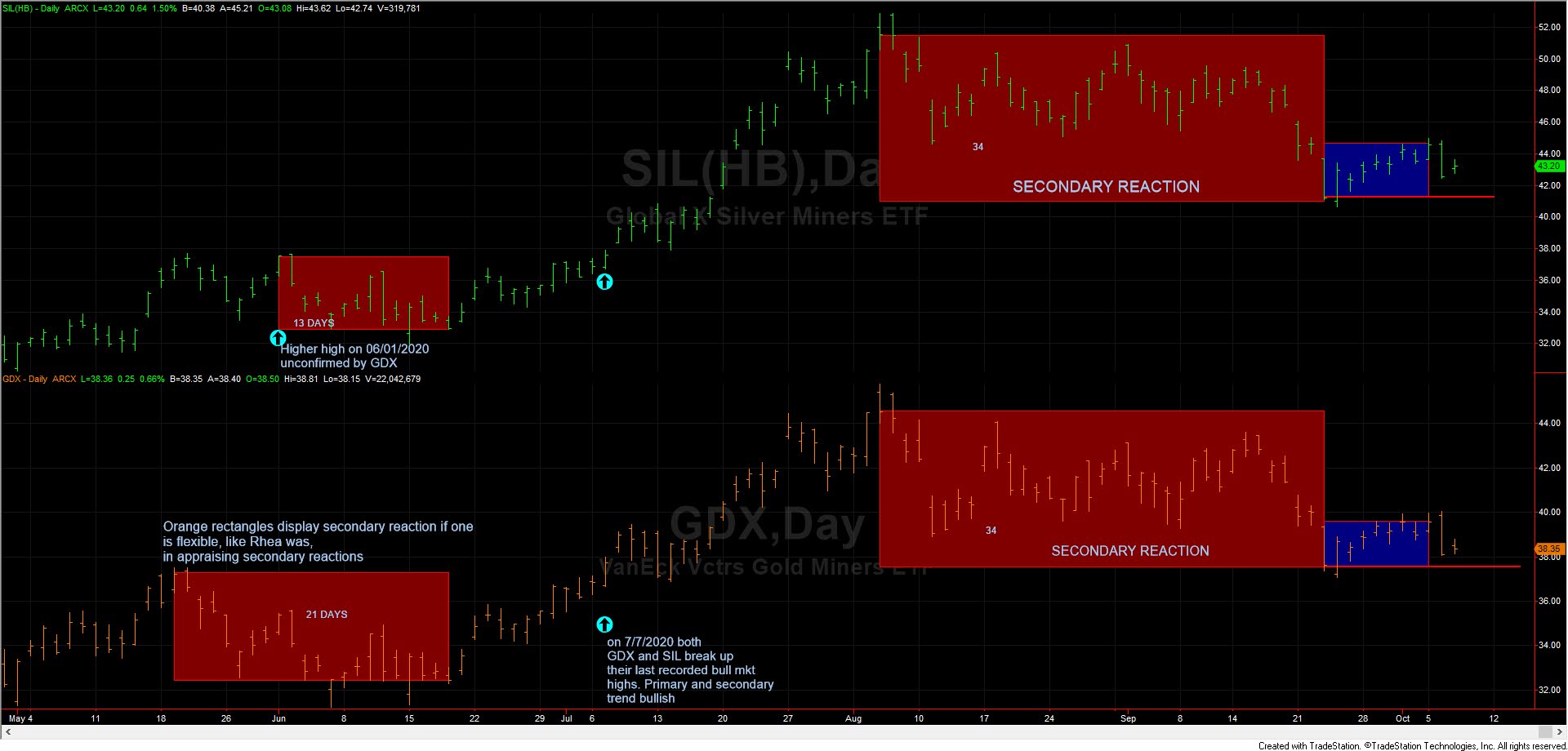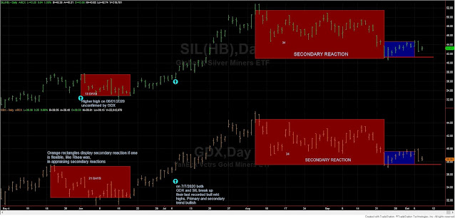 On August 5th, 2020, both SIL and GDX made their last recorded highs. From that day, prices dropped until the final bottom made on September 23rd, 2020, for 34 trading days. So the extent requirement for a secondary reaction was fulfilled.