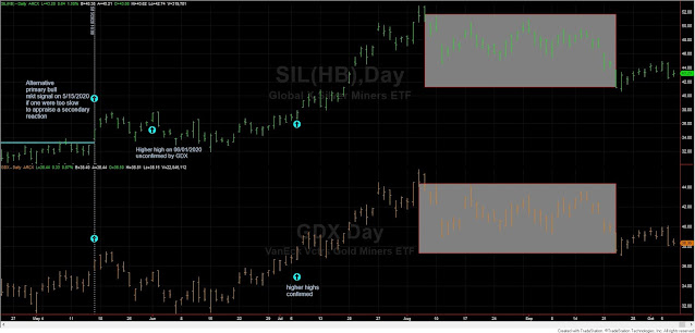 For those wishing to adhere to a more strict interpretation when determining secondary reactions, the primary trend would have remained bearish (bearish signal given on March 11th, 2020, as explained here) until 05/15/2020. On 05/15/2020 SIL finally broke up its last recorded primary bull market closing highs of 12/26/2019, and a primary bull market was signaled. GDX had done so on 4/22/2020. Thus, even under the most restrictive interpretation of the Dow Theory, the primary trend was signaled as bullish on 05/15/2020.