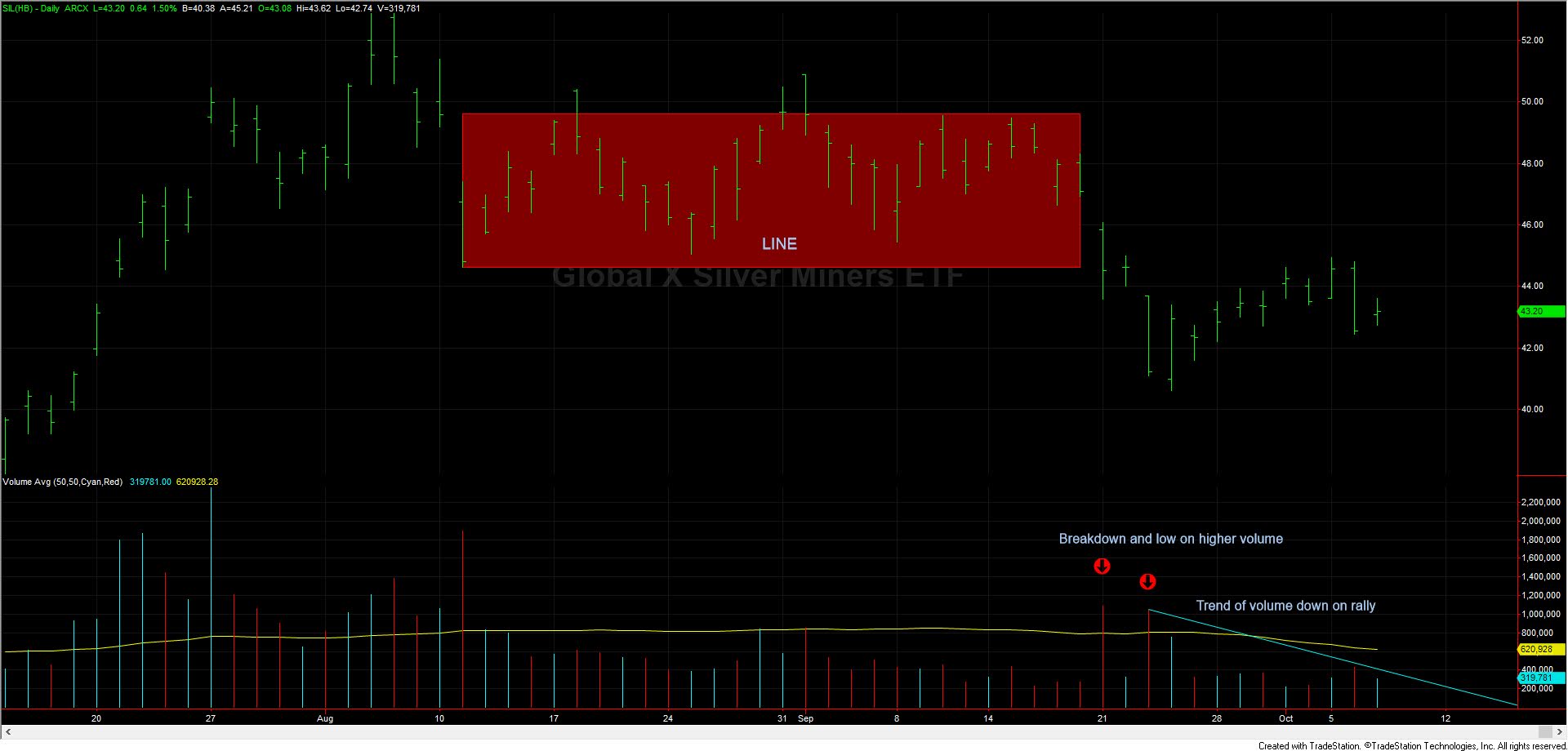 | SIL formed a “line” (confirmed by GDX). The line was broken down on high volume |