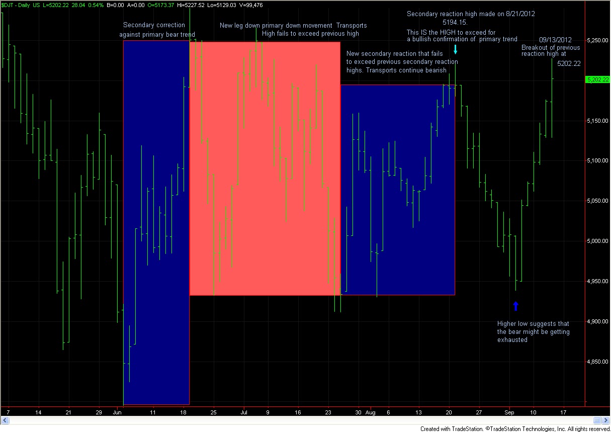 “we have to keep an eye on the Transports which are getting closer and closer to the previous secondary highs and are making higher lows since 07/25/2012. We will watch it like a hawk”
