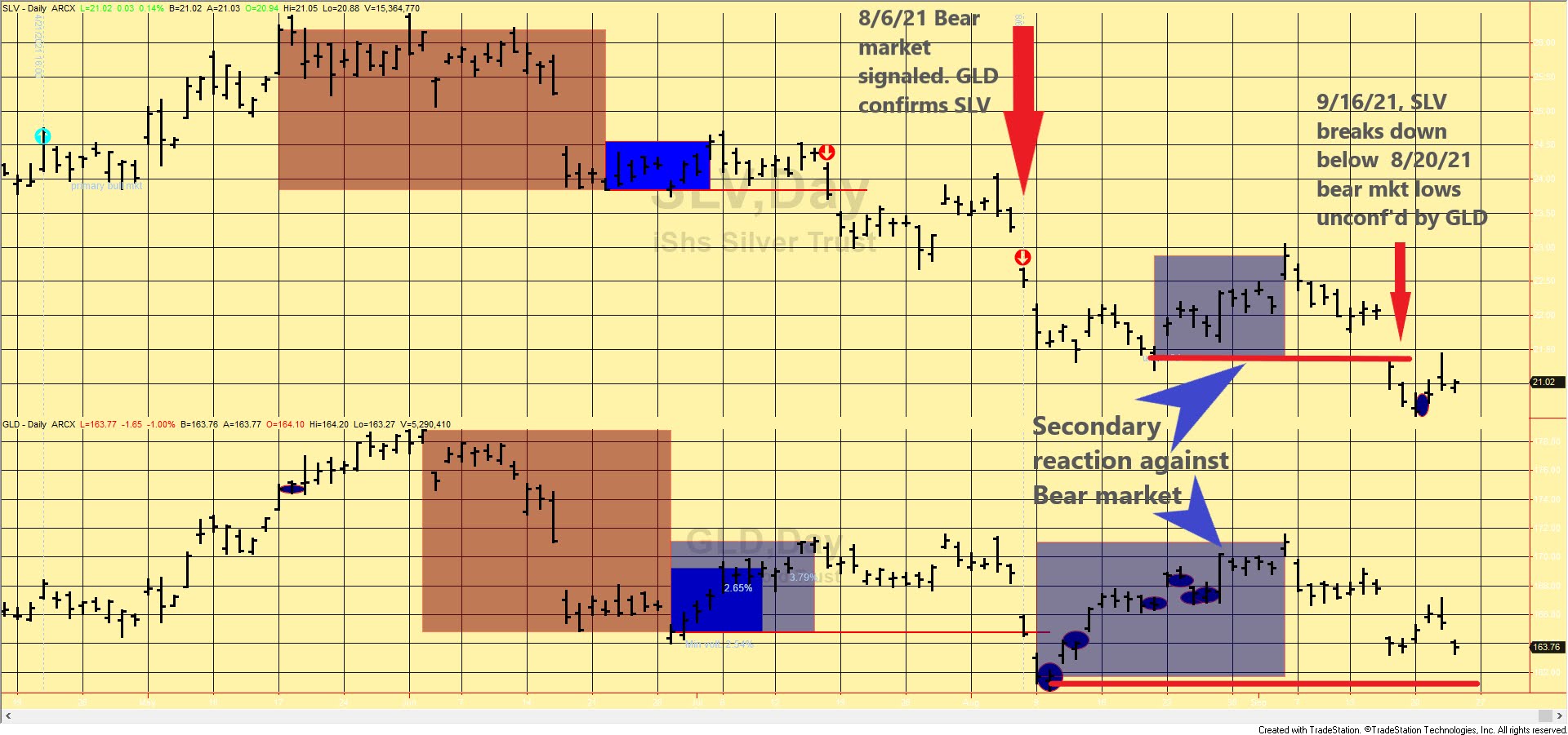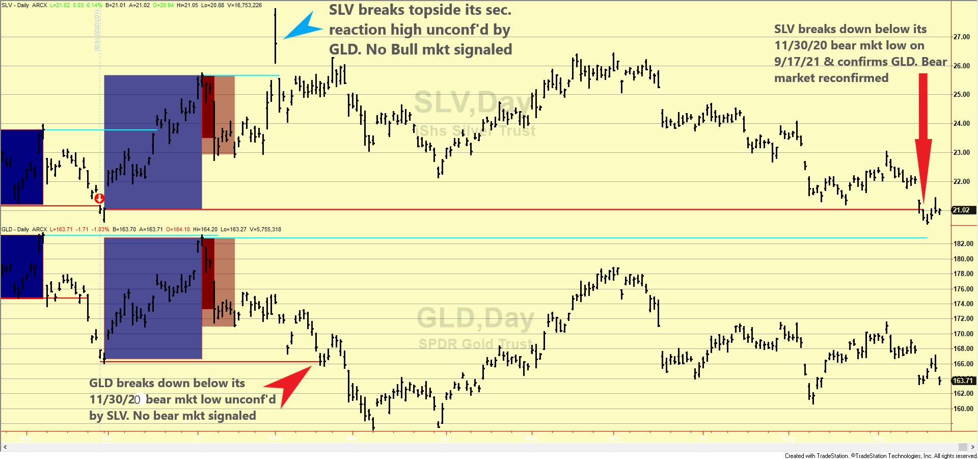 The secondary reaction against the primary bear market was finally ended on 9/17/21 when SLV violated its 11/30/2020 @21.05 bear market lows. By closing below such lows, SLV finally confirmed GLD, which had broken down below its 11/30/2021 bear market lows on 2/17/2021. So, the primary bear market has been reconfirmed, the secondary reaction has been terminated, and the secondary trend is now bearish.