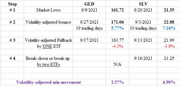 Off their 3/9/2021 secondary reaction highs, both ETFs declined. SLV broke down below its 8/20/2021 primary bear market lows on 9/16/2021, and continued lower until 9/20/2021 @20.59. GLD refused to confirm and stopped its decline on 9/17/2021 @163.77. Thus, a lower low by SLV unconfirmed by GLD does not change our assessment of the trends. The primary trend remains bearish and the secondary one bullish (secondary reaction). If GLD confirmed SLV by breaking down below its 8/9/2021 bear market lows, then both the primary and secondary trend would be bearish.