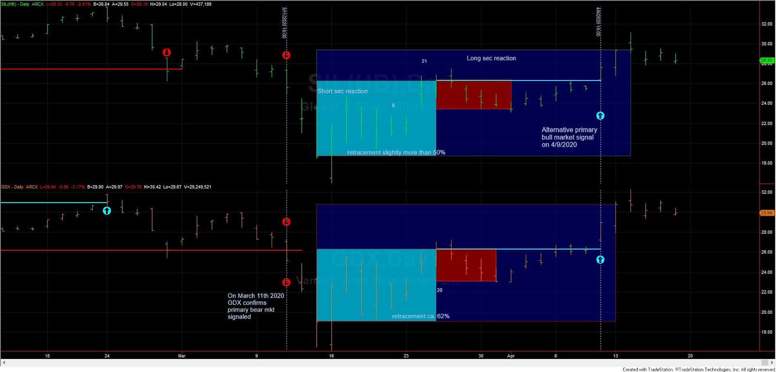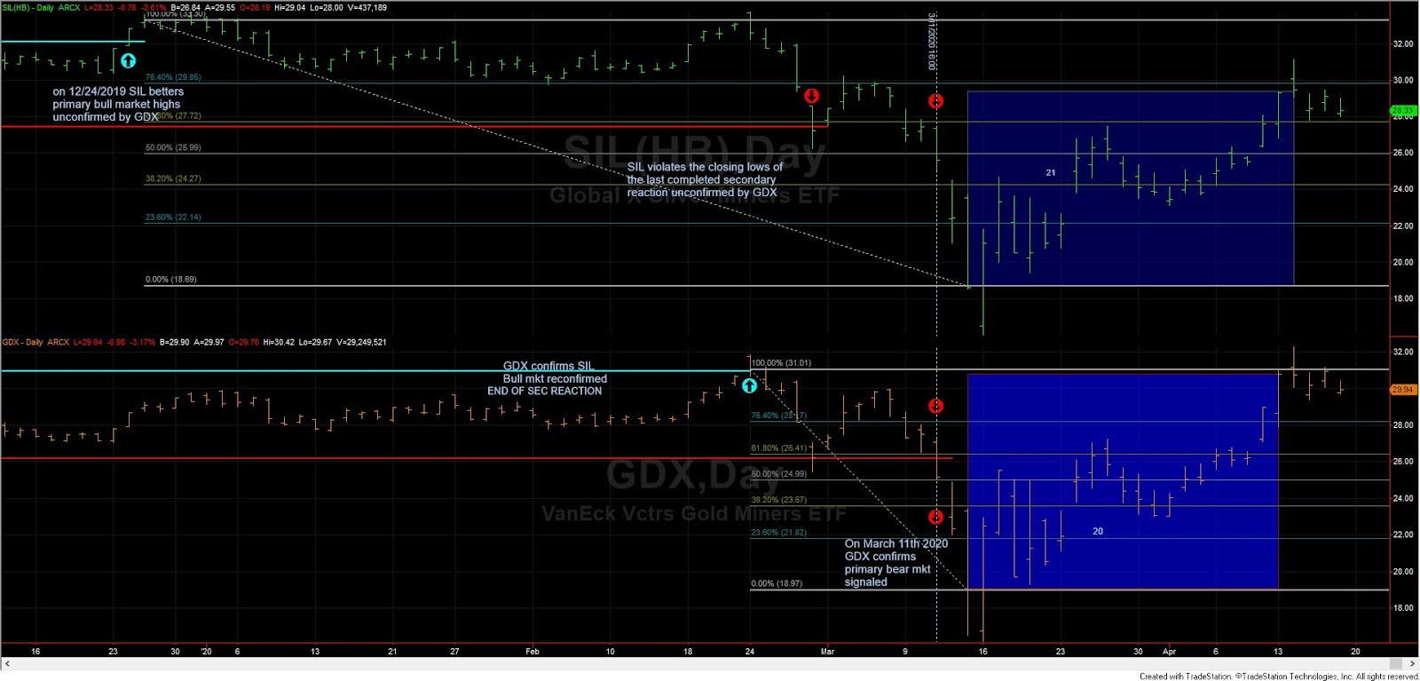 Following the turmoil which afflicted markets in late February and March, SIL violated on 02/28/2020 the lows of the last completed secondary reaction, which also constitutes a valid exit signal (especially under the Classical Dow Theory), unconfirmed by GDX. On March 11th, 2020, GDX confirmed, and, thus, we got a primary bear market signal.