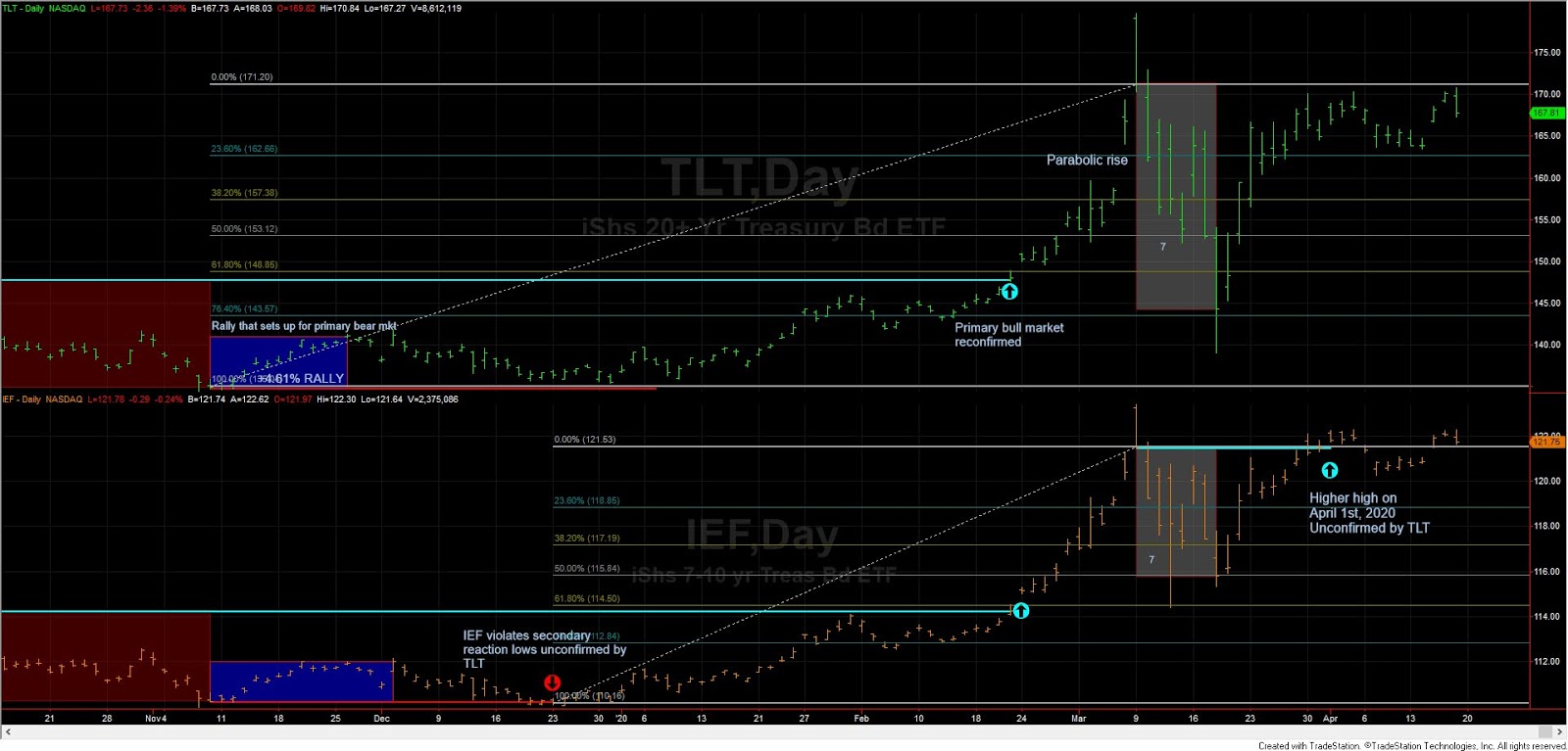On 02/21/2020 TLT bettered its last recorded primary bull market highs of 08/28/2019. On that date IEF equaled (but did not better) its previous recorded primary bull market highs of 09/04/2019, and hence there was no confirmation. On 02/24/2020 IEF did better its primary bull market highs and, therefore, we can declare the secondary reaction has ended, and the primary bull market as reconfirmed. From the reconfirmation date of 02/24/2020 TLT and IEF went parabolic reflecting the current chaos, which is plaguing all markets.