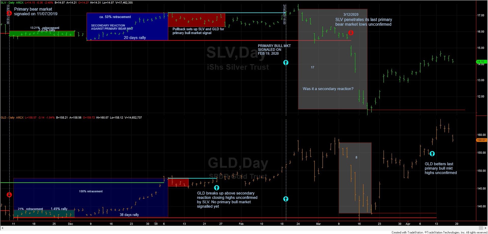b) If both SLV and GLD penetrated the shorter orange horizontal lines (secondary reaction lows), a primary bear market would be signaled.