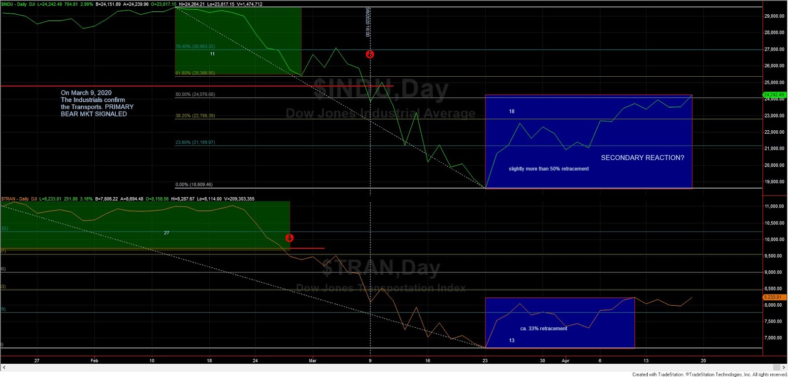 | The light blue boxes show an alternative secondary reaction which would have resulted in a primary bull market on 4/9/2020 |